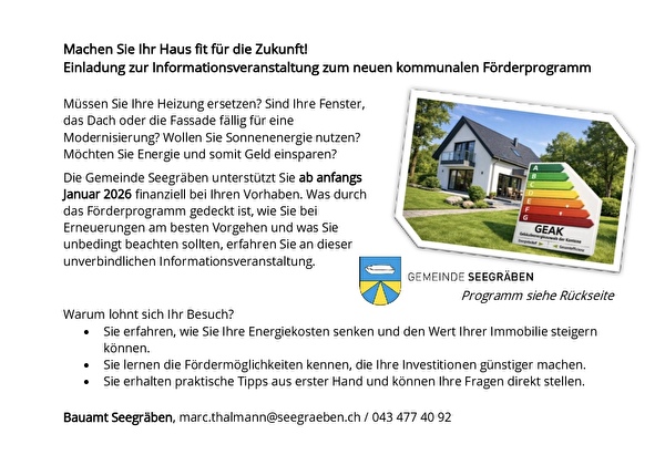 | Einladung Infoveranstaltung energetische Förderprogramme Seegräben_A4 einseitig (PDF, 111.96 kB) | Download | 0 | Einladung Infoveranstaltung energetische Förderprogramme Seegräben_A4 einseitig |
