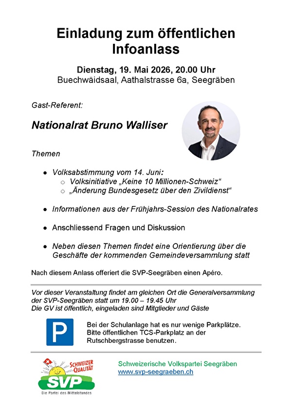Die SVP Seegräben lädt die Bevölkerung herzlich zum öffentlichen Informationsanlass ein. Als Gast-Referent dürfen wir Nationalrat Bruno Walliser begrüssen.